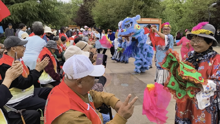 游玩兴致高涨之时,老人们自发围聚在一起,兴致盎然地唱起经典老歌,欢快的歌声婉转悠扬、回荡在公园各处。大家还伴着喜庆的乐曲扭起热闹的秧歌,步伐轻快、神采奕奕,脸上都洋溢着幸福灿烂的笑容,现场氛围热闹又温馨。